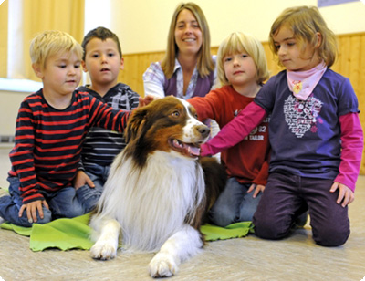 Direkt im Anschluss danach haben wir im Kindergarten „Junges Gemüse“ Schalksmühle angefangen mit den Kindern im therapeutisch - pädagogischen Sinne zu arbeiten. (Ein großes Dankeschön an den Kindergarten) Phil macht seine Arbeit ganz toll. Mittlerweile konnten wir sehr viele positive Erfahrungen sammeln. Ich bin sehr stolz auf meinen Hund.